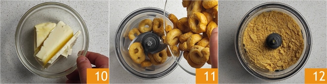 Para preparar la base, derretid la mantequilla 10, en el microondas o en una sartén a fuego bajo. Poned en la batidora los taralli 11 y triturad para reducirlos a polvo 12.