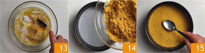 Transferid los taralli triturados a un bol y verted la mantequilla fundida templada, luego mezclad 10 hasta obtener una mezcla con consistencia arenosa. Verted la mezcla en un molde de 20 cm de diámetro 20, previamente engrasado y forrado con papel de horno. Nivelad con el dorso de una cuchara 15. Guardad el molde en la nevera para que se solidifique la base.