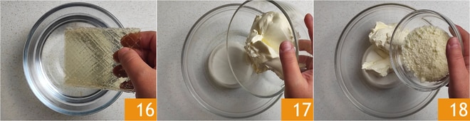 Poned la gelatina en remojo en agua fría 16. Mientras tanto, dedicad vuestro tiempo a preparar la crema de queso: en un bol unid la ricota, el queso para untar 17 y el Grana Padano DOP rallado 18.