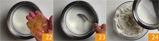 Verted la leche en un cazo y calentadla hasta casi hervir, retiradla del fuego y añadid la gelatina bien escurrida 22. Mezclad para disolverla completamente 23. Verted la leche en el bol con los quesos 24.