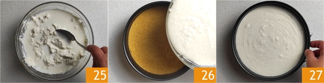 Mezclad 25 hasta obtener una crema bastante líquida y homogénea. Sacad el molde de la nevera y verted la crema sobre la base 26, moviendo el molde para nivelar la crema 27 y guardadlo nuevamente en la nevera por una hora.