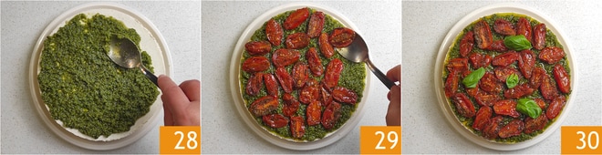 Pasado el tiempo de reposo, sacad la cheesecake del molde y untad el pesto sobre la superficie 28. Adornad con los tomatitos confit 29 y unas hojas de albahaca 30. ¡La cheesecake salada con pesto y tomatitos está lista para ser degustada!