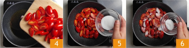 Poned los tomatitos en la sartén 4, añadid el azúcar 5, distribuyéndolo uniformemente sobre todos los tomatitos, y ajustad de sal 6.