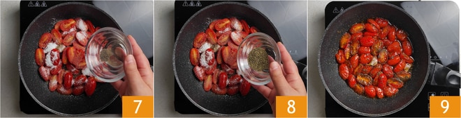 Sazonad también con la pimienta 7 y el orégano 8. Coced a fuego alto durante unos 8 minutos, o hasta que el azúcar se haya caramelizado 9. Reservad los tomatitos confit.