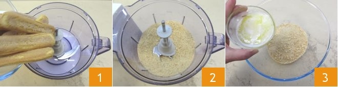 Para preparar la cheesecake tiramisú, comienza con la base. Prepara el café (espresso o de moka): necesitarás un total de 170 g (y déjalo enfriar después), luego derrite la mantequilla en un cazo teniendo cuidado de que no se queme, y déjala enfriar. Mientras tanto, coloca los bizcochos de soletilla en la batidora 1 y activa las cuchillas hasta reducirlos a polvo 2. Transfiérelos a un bol y agrega la mantequilla derretida y enfriada 3.