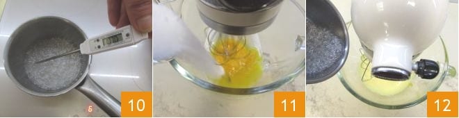 Controla la temperatura con un termómetro alimentario 10; cuando alcance los 115°, coloca las yemas y el resto del azúcar en la batidora y comienza a batir con las varillas 11. Cuando el jarabe alcance los 120°, retíralo del fuego y empieza a verterlo en la batidora 12, poco a poco, en 3 partes, apagando las varillas de cada vez para recoger el jarabe que quede en los bordes del bol.