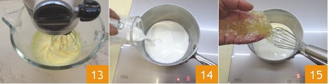 Continúa batiendo hasta que la mezcla esté completamente fría 13. Luego, en un cazo, calienta la nata (no es necesario que hierva) 14 y añade la gelatina que tenías en remojo, tras haberla escurrido bien 15.