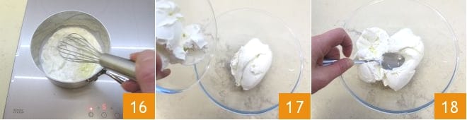 Mezcla bien para disolver la gelatina de manera uniforme 16 y deja enfriar. En un bol, combina el queso crema y el mascarpone 17, luego mézclalos bien 18.