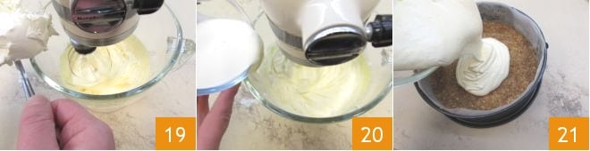 Añade los quesos, una cucharada a la vez, en la batidora manteniéndola en funcionamiento 19. Finalmente, añade también la nata en la que has disuelto la gelatina ya fría 20. Deja que las varillas se mezclen un poco más para amalgamar todos los ingredientes de la crema, luego apágalas. Saca de la nevera la base endurecida de la cheesecake y vierte la primera capa de crema 21.