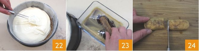Alisa la superficie con una espátula 22. Sumerge rápidamente los bizcochos de soletilla en los 120 g restantes de café 23 y córtalos por la mitad 24.