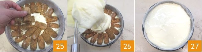 Coloca los medios bizcochos de soletilla en círculos concéntricos dentro del molde 25, luego cubre con la segunda y última capa de crema 26 y alísala también. Pon tu cheesecake tiramisú en la nevera para que se endurezca por al menos 3-4 horas 27.
