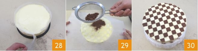 Tras el tiempo de reposo, retira con cuidado el disco del molde y el papel en los bordes 28. En este punto, puedes simplemente espolvorear la superficie del dulce con cacao amargo tamizado, o bien, para obtener un tablero como el nuestro, procede así: dibuja en un papel de horno un círculo del mismo diámetro que el molde; con una regla traza las líneas horizontales y verticales para formar los cuadros y finalmente, usando un cúter o una cuchilla, recorta la mitad de los cuadros de manera alternada para obtener un tablero de ajedrez. Pide ayuda para sostener el papel de horno sobre el dulce y espolvorea con el cacao amargo 29. Luego retira el papel de horno: ¡tu cheesecake tiramisú está lista para ser disfrutada 30!