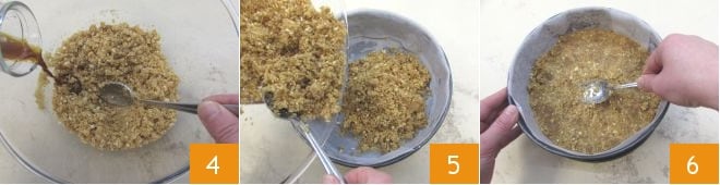 Añade también 50 g de café 4, luego mezcla bien. Engrasa y forra con papel de horno un molde desmontable de 22 cm de diámetro y vierte la mezcla de bizcochos de soletilla 5. Distribúyela uniformemente en el fondo, presionando bien con el dorso de una cuchara para compactarla 6. Finalmente, para que se endurezca, pon el molde en la nevera por al menos media hora.