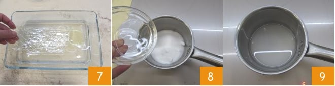 Mientras tanto, dedícate a la crema. Primero pon a remojo la gelatina en agua fría 7. Mientras tanto, coloca en un cazo de fondo grueso 65 g de azúcar y 45 g de agua 8. Lleva el jarabe a ebullición 9.