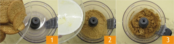 Para realizar la cheesecake, empezad por la base: derretid la mantequilla en un cazo y dejad que se temple. Verted las galletas en un procesador 1 y trituradlas finamente mientras añadís la mantequilla derretida 2 y una pizca de sal. Deberéis obtener una mezcla con una consistencia similar a la de la arena mojada 3.