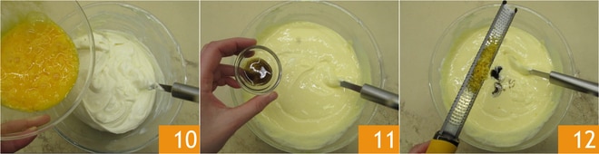Batid los huevos en otro bol y vertedlos en el bol poco a poco 10, mezclando para incorporarlos de manera homogénea. Aromatizad la mezcla con el extracto de vainilla 11 y la ralladura de limón 12.