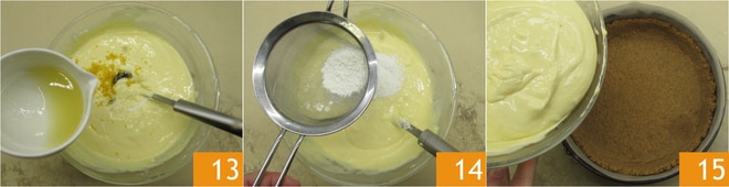 Agregad también el zumo de limón 13 y mezclad bien. Finalmente, tamizad la maicena en el bol 14 y amalgamad todo. Golpead el bol contra la superficie de trabajo un par de veces para eliminar las burbujas de aire, luego verted la crema de queso sobre la base de galletas ya enfriada 15.