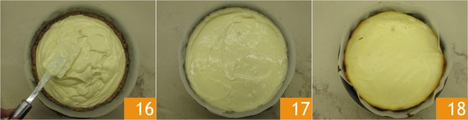 Nivelad ligeramente la superficie 16, golpead una vez más el molde contra la superficie de trabajo y cocinad en el horno estático a 150° durante unos 70-80 minutos, colocando en la base del horno un cazo lleno de agua caliente para crear la humedad adecuada 17. Una vez cocida, la cheesecake todavía estará ligeramente temblorosa en el centro. Apagad el horno y dejad que se enfríe completamente en su interior. Cuando se haya enfriado 18, transferid la cheesecake al frigorífico y dejad que se endurezca durante al menos 4 horas, o mejor durante toda la noche.