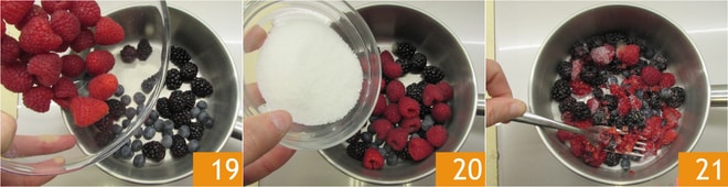 Pasado el tiempo de endurecimiento, dedicadnos a la decoración: verted las moras, los arándanos y las frambuesas en un cazo 19 junto con el azúcar 20. Aplastad con un tenedor 21, llevad a ebullición y cocinad durante unos 5 minutos, mezclando a menudo.