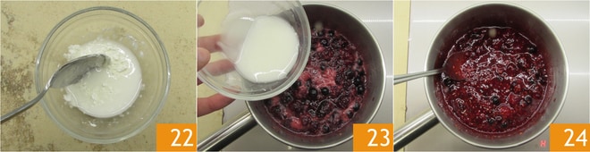 Mientras tanto, diluid la maicena con el agua 22. Verted la mezcla poco a poco en el cazo, hasta lograr la consistencia deseada 23; la salsa debe resultar fluida y brillante 24.