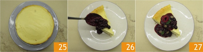 En este punto, podéis desmoldar cuidadosamente la cheesecake y transferirla a un plato de servir 25. Servid vuestra hermosa cheesecake decorada con la salsa de frutos del bosque 26 y algunas hojitas de menta 27.