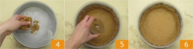 Engrasad y forrad con papel de horno un molde desmontable de 24 cm de diámetro, cubriendo tanto la base como los bordes. Transferid la mezcla de galletas al molde 4 y presionad bien para compactarla, ayudándoos con el fondo de un vaso 5. Cocinad la base de galletas en el horno estático precalentado a 180° durante unos 10 minutos, luego sacadla y dejad que se enfríe completamente 6.