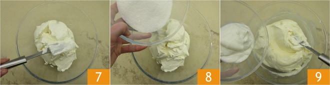 Bajad la temperatura del horno a 150° y pasad a la preparación de la crema. Verted el queso en un bol grande y ablandadlo con una espátula 7, luego añadid el azúcar 8 y mezclad para integrarlo. Incorporad también la nata agria 9 y mezclad de nuevo.