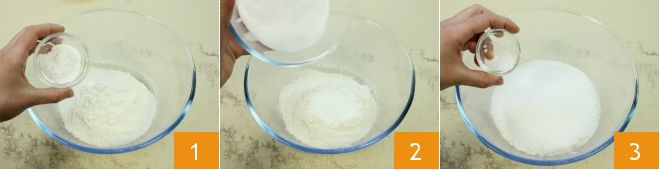 Para preparar la chiffon cake multicolor, comenzad con la masa: en un bol, verted la harina tamizada, la levadura 1, el azúcar 2 y la sal 3.