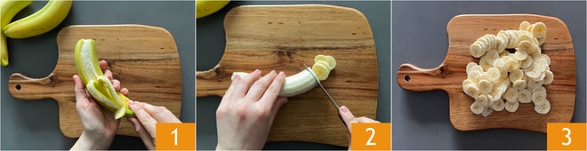Para preparar las chips de plátano, primero pela los plátanos 1 y córtalos finamente 2, obteniendo rodajas de un grosor máximo de 3 mm 3.