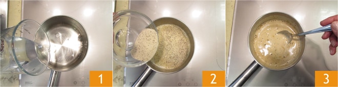 Para realizar el choco-latte blanco calienta el agua en un cazo hasta alcanzar la temperatura de 85° 1. Al llegar a la temperatura, vierte el cappuccino soluble en el agua 2 y mezcla bien. Espera unos 20 segundos, mezcla nuevamente y deja que se temple 3.