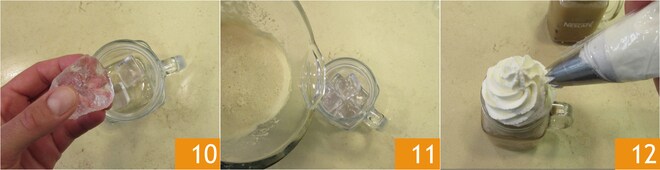 Transfiere la nata montada a una manga pastelera con boquilla en forma de estrella. Monta tu choco-latte: en un vaso, vierte 5 cubitos de hielo, la mezcla batida 11 y decora con la nata 12.