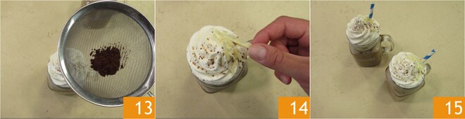 Espolvorea con el polvo de café 13 y decora con las virutas de chocolate blanco 14. El choco-latte está listo para disfrutar 15.