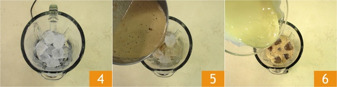 Vierte en el vaso de la batidora el hielo en cubitos 4, el cappuccino templado 5 y el chocolate fundido 6, derretido al baño maría. Enciende la batidora y mezcla la composición durante unos 60 segundos.