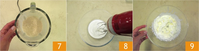 Reserva 7 y mientras tanto monta la nata con las varillas eléctricas 8 hasta que esté espumosa 9.