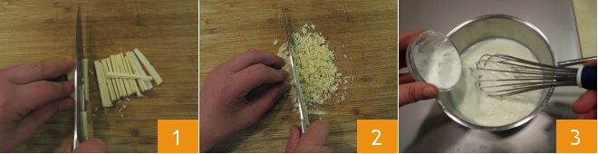 Para preparar el chocolate blanco con menta, pica el chocolate blanco (1-2). Vierte la leche en un cazo y enciende el fuego a medio, luego añade la maicena 3 y mezcla con la batidora de varillas.