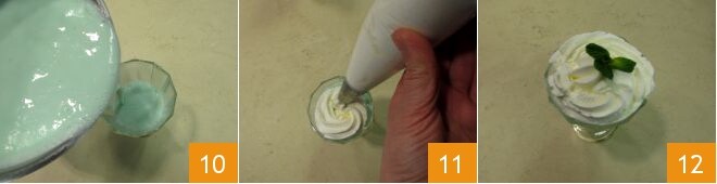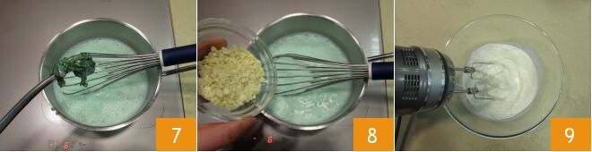 Apaga el fuego, elimina las hojas de menta 7 y vierte el chocolate blanco picado 8. Mezcla de nuevo con la batidora de varillas para que se derrita. El chocolate caliente blanco con menta está listo. Ahora monta la nata con las batidoras eléctricas 9 y colócala en una manga pastelera.