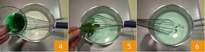 Añade el jarabe de menta 4, luego las hojitas de menta 5, mezcla continuamente y lleva a ebullición (tardará unos 4-5 minutos).