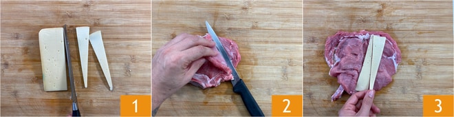 Para las chuletas a la valdostana, comienza cortando el jamón y la fontina en rodajas de medio centímetro 1. Luego limpia el hueso de la carne, retira la carne del hueso y ábrela en forma de libro con un cuchillo de carne muy afilado 2. Golpea ligeramente con un mazo de carne humedecido (para que la carne no se rompa al golpearla), para obtener un grosor de aproximadamente 0,5 cm. Rellena con algunas rodajas de fontina 3.