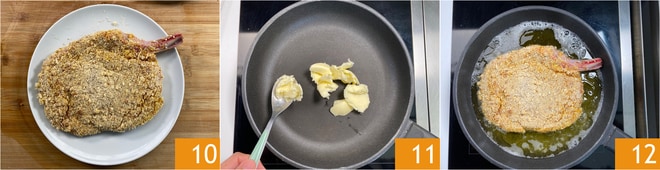 Deberás proceder a un doble empanado, por lo tanto nuevamente en huevo y pan rallado para que las chuletas queden bien selladas, especialmente en los bordes 10. Puedes verter la mantequilla clarificada en una sartén antiadherente muy amplia 11: cuando esté derretida y a temperatura, puedes cocinar una chuleta a la vez 12.