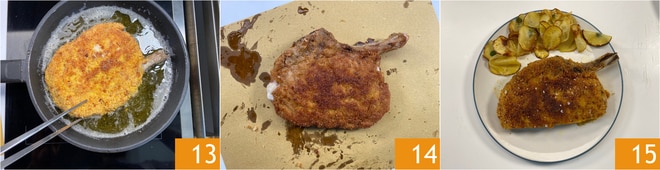 Dora bien por ambos lados, tomará unos 18 minutos en total 13, luego escurre sobre papel absorbente para frituras 14. Deja reposar durante unos 5 minutos para que los jugos se redistribuyan. Condimenta con copos de sal y sirve tu chuleta a la valdostana, tal vez con patatas fritas o al horno o verduras salteadas 15.