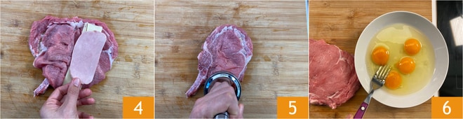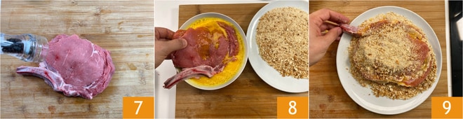 Sala y pimienta al gusto la carne por ambos lados 7. Pasa la chuleta así rellena primero por los huevos 8 y luego por el pan rallado 9, asegurándote de haber empanado de manera uniforme ambos lados.
