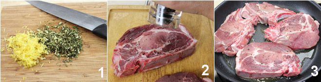 Para preparar las chuletas de cerdo a la cerveza y hierbas aromáticas, comienza limpiando y picando el ajo, las hierbas aromáticas y la piel de limón 1. Coloca las 4 chuletas sobre una tabla de cortar y salpimiéntalas 2 por cada lado. Calienta el aceite en una sartén y cocina la carne 5-6 minutos por cada lado 3.