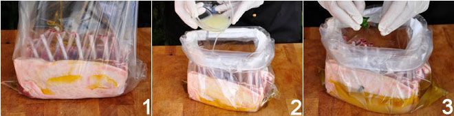 Se comienza con la marinada del carré. En una bolsa de plástico para alimentos, con cierre de cremallera (se encuentran en todos los supermercados) vamos a introducir, después de la carne, el jugo de manzana 1, jugo de lima 2, las hojas de menta desmenuzadas con las manos 3,