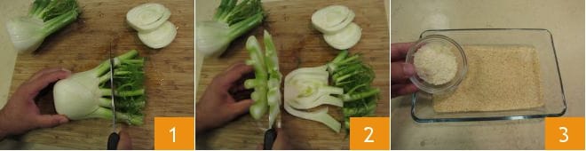 Para preparar las chuletas de hinojo, lo primero que debes hacer es lavarlos bien bajo el agua corriente. Luego elimina buena parte de la sección con las hojas 1, y corta los hinojos en rodajas a lo largo 2. Mientras tanto, vierte el pan rallado en un bol, añade el queso parmesano 3,