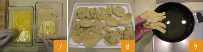 luego por el pan rallado 7 y colócalas poco a poco en una bandeja 8. Tan pronto como el aceite haya alcanzado la temperatura adecuada, fríe las chuletas 1-2 a la vez 9.