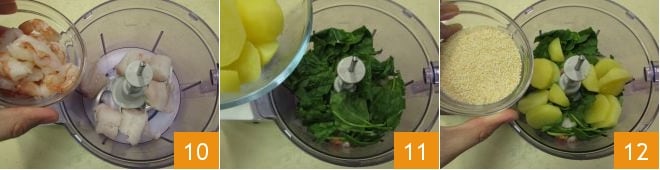 Una vez que las patatas estén cocidas, dejadlas enfriar un poco, luego peladlas. Ahora poned en la batidora el bacalao, los langostinos 10, las espinacas frescas bien lavadas y secas, añadid también las patatas 11 y el pan rallado 12, salpimentad.