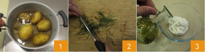 Para preparar las chuletas de pescado con salsa de yogur, primero hervid las patatas 1 durante unos 30 minutos o hasta que estén suaves (el tiempo de cocción puede variar según su tamaño). Mientras tanto, preparad la salsa: picad el hinojo con el cuchillo 2, en un bol pequeño verted el yogur y el aceite de oliva 3.