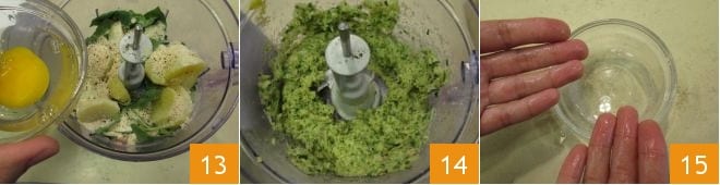 Por último, añadid también el huevo 13 y batid todos los ingredientes hasta obtener una mezcla compacta y homogénea 14. Ahora podéis dar forma a vuestras chuletas: humedeced las manos con un poco de agua 15 para trabajar mejor la mezcla.