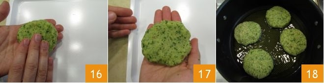 Tomad una porción de mezcla, dadle una forma redonda y aplastadla ligeramente 16 para obtener una chuleta, a medida que las formáis, colocadlas en una bandeja 17. Una vez listas, ponedlas a endurecer en el congelador durante 10 minutos. Terminad con la cocción de las chuletas: calentad 4 cucharadas de aceite en una cazuela, tomad las chuletas endurecidas y cocinadlas durante 3 minutos por un lado y 2 minutos por el otro 18.