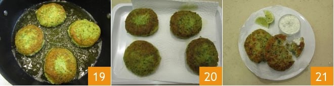 Cuando tengan un bonito color dorado 19, escurridlas y transferidlas a una bandeja cubierta con papel absorbente 20. Servid las chuletas de pescado aún calientes acompañadas con la salsa de yogur 21.